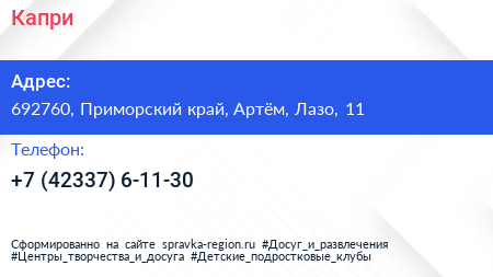 Капри по адресу 692760, Приморский край, Артём, Лазо, 11 в дальнейшем Организация, размещена в следующих категориях: