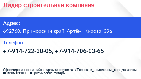 Лидер, строительная компания по адресу 692760, Приморский край, Артём, Кирова, 39а в дальнейшем Организация, размещена в следующих категориях: