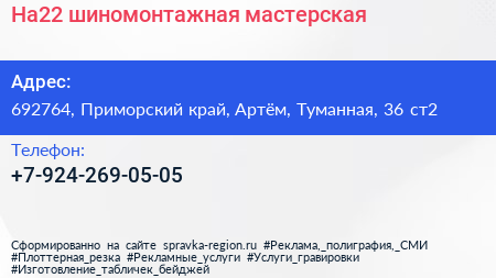 На22, шиномонтажная мастерская по адресу 692764, Приморский край, Артём, Туманная, 36 ст2 в дальнейшем Организация, размещена в следующих категориях: