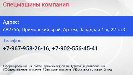 Спецмашины, компания по адресу 692756, Приморский край, Артём, Западная 1-я, 22 ст3 в дальнейшем Организация, размещена в следующих категориях: