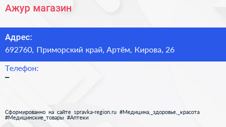 Ажур, магазин по адресу 692760, Приморский край, Артём, Кирова, 26 в дальнейшем Организация, размещена в следующих категориях:
