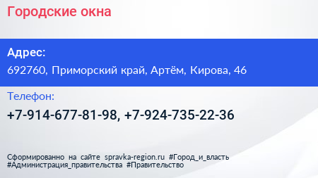 Городские окна по адресу 692760, Приморский край, Артём, Кирова, 46 в дальнейшем Организация, размещена в следующих категориях: