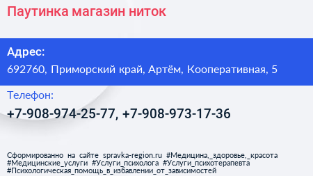 Паутинка, магазин ниток по адресу 692760, Приморский край, Артём, Кооперативная, 5 в дальнейшем Организация, размещена в следующих категориях: