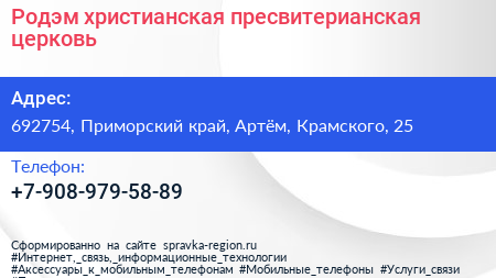 Родэм, христианская пресвитерианская церковь по адресу 692754, Приморский край, Артём, Крамского, 25 в дальнейшем Организация, размещена в следующих категориях: