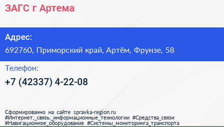 ЗАГС г. Артема по адресу 692760, Приморский край, Артём, Фрунзе, 58 в дальнейшем Организация, размещена в следующих категориях: