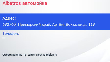 Albatros, автомойка по адресу 692760, Приморский край, Артём, Вокзальная, 119 в дальнейшем Организация, размещена в следующих категориях: