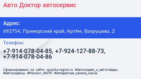 Авто-Доктор, автосервис по адресу 692754, Приморский край, Артём, Вахрушева, 2 в дальнейшем Организация, размещена в следующих категориях: