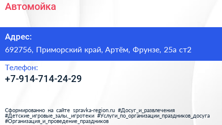 Автомойка по адресу 692756, Приморский край, Артём, Фрунзе, 25а ст2 в дальнейшем Организация, размещена в следующих категориях:
