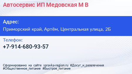 Автосервис, ИП Медовская М.В. по адресу Приморский край, Артём, Центральная улица, 2Б в дальнейшем Организация, размещена в следующих категориях: