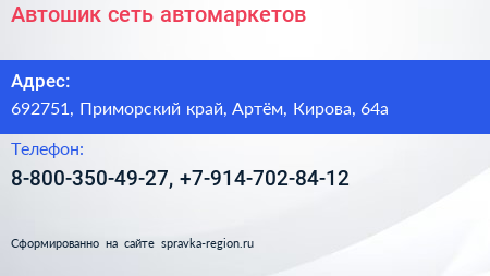 Автошик, сеть автомаркетов по адресу 692751, Приморский край, Артём, Кирова, 64а в дальнейшем Организация, размещена в следующих категориях: