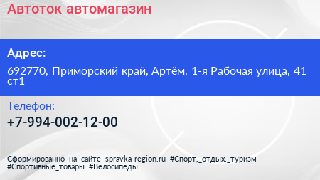 Автоток, автомагазин по адресу 692770, Приморский край, Артём, 1-я Рабочая улица, 41 ст1 в дальнейшем Организация, размещена в следующих категориях: