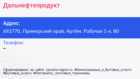 Дальнефтепродукт по адресу 692770, Приморский край, Артём, Рабочая 1-я, 80 в дальнейшем Организация, размещена в следующих категориях: