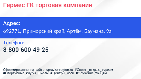 Гермес ГК, торговая компания по адресу 692771, Приморский край, Артём, Баумана, 9а в дальнейшем Организация, размещена в следующих категориях: