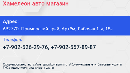 Хамелеон-авто, магазин по адресу 692770, Приморский край, Артём, Рабочая 1-я, 18а в дальнейшем Организация, размещена в следующих категориях: