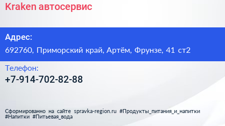 Kraken, автосервис по адресу 692760, Приморский край, Артём, Фрунзе, 41 ст2 в дальнейшем Организация, размещена в следующих категориях: