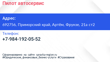 Пилот, автосервис по адресу 692756, Приморский край, Артём, Фрунзе, 21а ст2 в дальнейшем Организация, размещена в следующих категориях: