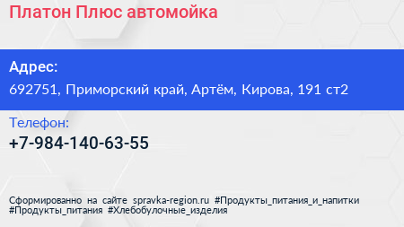 Платон Плюс, автомойка по адресу 692751, Приморский край, Артём, Кирова, 191 ст2 в дальнейшем Организация, размещена в следующих категориях: