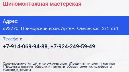Шиномонтажная мастерская по адресу 692770, Приморский край, Артём, Океанская, 2/1 ст4 в дальнейшем Организация, размещена в следующих категориях: