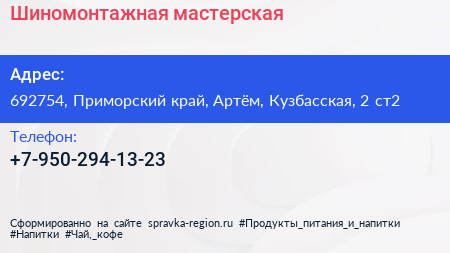 Шиномонтажная мастерская по адресу 692754, Приморский край, Артём, Кузбасская, 2 ст2 в дальнейшем Организация, размещена в следующих категориях: