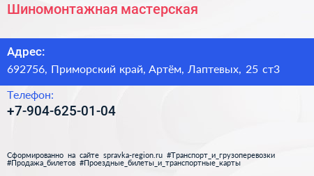 Шиномонтажная мастерская по адресу 692756, Приморский край, Артём, Лаптевых, 25 ст3 в дальнейшем Организация, размещена в следующих категориях: