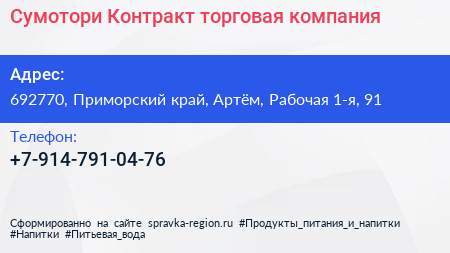 Сумотори-Контракт, торговая компания по адресу 692770, Приморский край, Артём, Рабочая 1-я, 91 в дальнейшем Организация, размещена в следующих категориях: