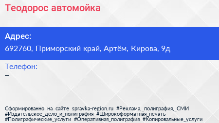 Теодорос, автомойка по адресу 692760, Приморский край, Артём, Кирова, 9д в дальнейшем Организация, размещена в следующих категориях: