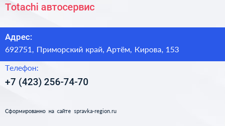 Totachi, автосервис по адресу 692751, Приморский край, Артём, Кирова, 153 в дальнейшем Организация, размещена в следующих категориях: