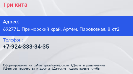 Три кита по адресу 692771, Приморский край, Артём, Паровозная, 8 ст2 в дальнейшем Организация, размещена в следующих категориях: