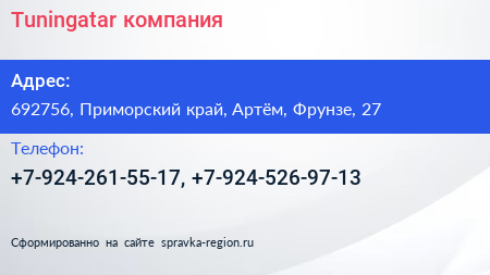 Tuningatar, компания по адресу 692756, Приморский край, Артём, Фрунзе, 27 в дальнейшем Организация, размещена в следующих категориях: