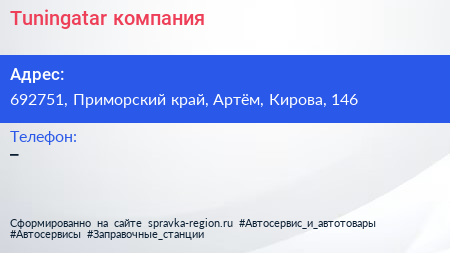 Tuningatar, компания по адресу 692751, Приморский край, Артём, Кирова, 146 в дальнейшем Организация, размещена в следующих категориях: