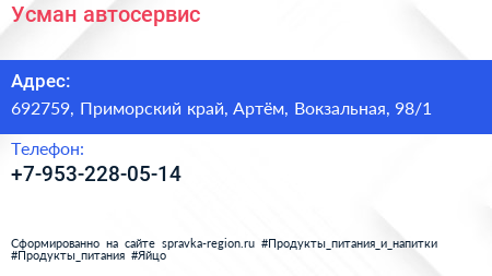 Усман, автосервис по адресу 692759, Приморский край, Артём, Вокзальная, 98/1 в дальнейшем Организация, размещена в следующих категориях: