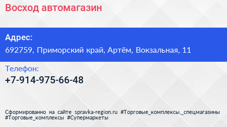 Восход, автомагазин по адресу 692759, Приморский край, Артём, Вокзальная, 11 в дальнейшем Организация, размещена в следующих категориях: