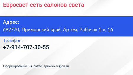 Евросвет, сеть салонов света по адресу 692770, Приморский край, Артём, Рабочая 1-я, 16 в дальнейшем Организация, размещена в следующих категориях: