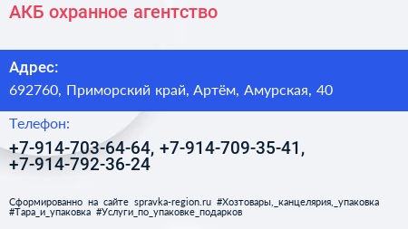АКБ, охранное агентство по адресу 692760, Приморский край, Артём, Амурская, 40 в дальнейшем Организация, размещена в следующих категориях: