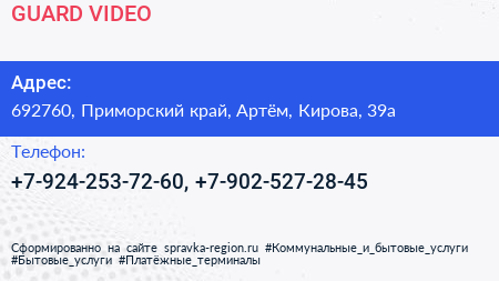 GUARD VIDEO по адресу 692760, Приморский край, Артём, Кирова, 39а в дальнейшем Организация, размещена в следующих категориях: