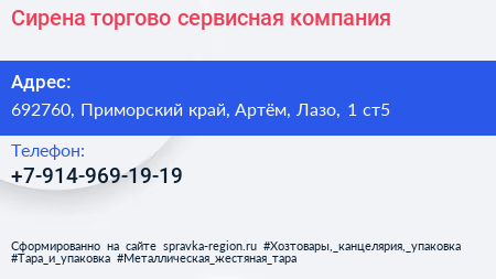 Сирена, торгово-сервисная компания по адресу 692760, Приморский край, Артём, Лазо, 1 ст5 в дальнейшем Организация, размещена в следующих категориях: