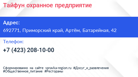 Тайфун, охранное предприятие по адресу 692771, Приморский край, Артём, Батарейная, 42 в дальнейшем Организация, размещена в следующих категориях: