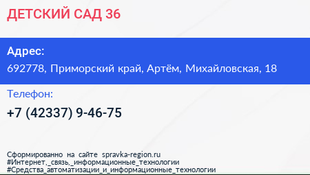 ДЕТСКИЙ САД № 36 по адресу 692778, Приморский край, Артём, Михайловская, 18 в дальнейшем Организация, размещена в следующих категориях: