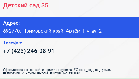 Детский сад №35 по адресу 692770, Приморский край, Артём, Пугач, 2 в дальнейшем Организация, размещена в следующих категориях: