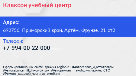 Клаксон, учебный центр по адресу 692756, Приморский край, Артём, Фрунзе, 21 ст2 в дальнейшем Организация, размещена в следующих категориях: