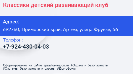 Классики, детский развивающий клуб по адресу 692760, Приморский край, Артём, улица Фрунзе, 56 в дальнейшем Организация, размещена в следующих категориях: