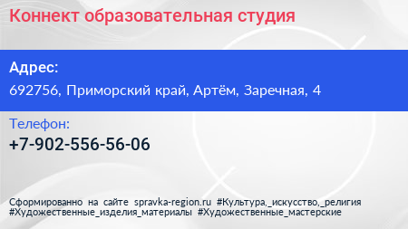Коннект, образовательная студия по адресу 692756, Приморский край, Артём, Заречная, 4 в дальнейшем Организация, размещена в следующих категориях: