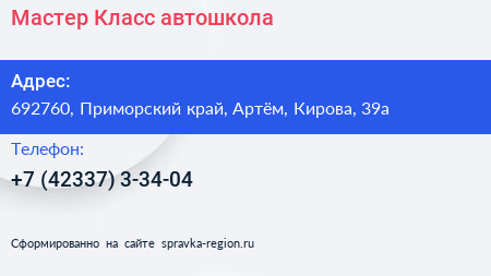 Мастер Класс, автошкола по адресу 692760, Приморский край, Артём, Кирова, 39а в дальнейшем Организация, размещена в следующих категориях: