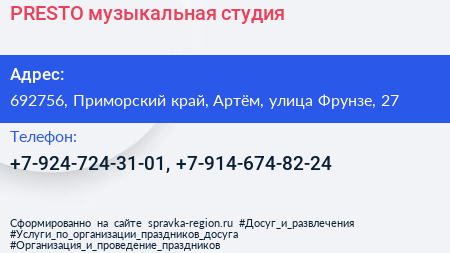 PRESTO, музыкальная студия по адресу 692756, Приморский край, Артём, улица Фрунзе, 27 в дальнейшем Организация, размещена в следующих категориях: