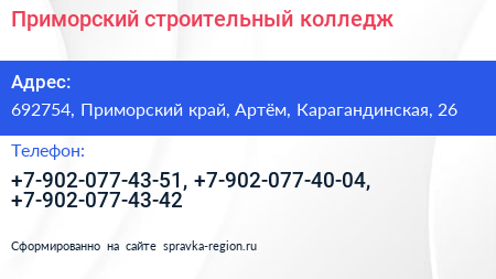 Приморский строительный колледж по адресу 692754, Приморский край, Артём, Карагандинская, 26 в дальнейшем Организация, размещена в следующих категориях: