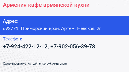 Армения, кафе армянской кухни по адресу 692771, Приморский край, Артём, Невская, 2г в дальнейшем Организация, размещена в следующих категориях: