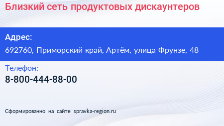 Близкий, сеть продуктовых дискаунтеров по адресу 692760, Приморский край, Артём, улица Фрунзе, 48 в дальнейшем Организация, размещена в следующих категориях: