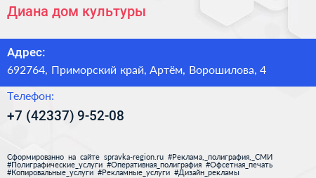 Диана, дом культуры по адресу 692764, Приморский край, Артём, Ворошилова, 4 в дальнейшем Организация, размещена в следующих категориях: