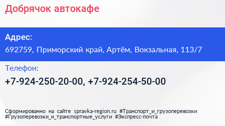 Добрячок, автокафе по адресу 692759, Приморский край, Артём, Вокзальная, 113/7 в дальнейшем Организация, размещена в следующих категориях: