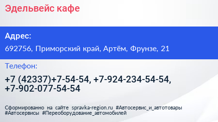 Эдельвейс, кафе по адресу 692756, Приморский край, Артём, Фрунзе, 21 в дальнейшем Организация, размещена в следующих категориях: